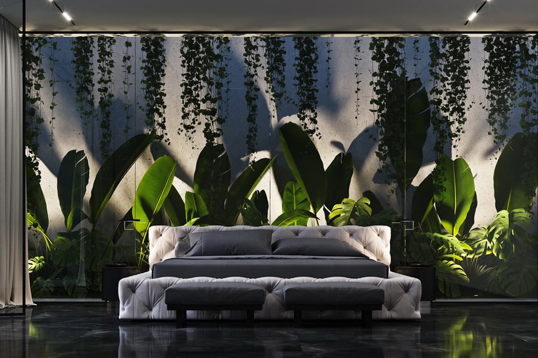 A striking mural will create visual impact in a bedroom. The interior is outfitted with a custom bed and bench by jm upholstery which are covered in a rosemary hallgarten alpaca fabric. Give your modern bedroom design a platform.